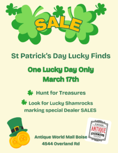Feeling lucky? Join us at Antique World Mall on March 17 for a fun St. Patrick’s Day Mini Event!